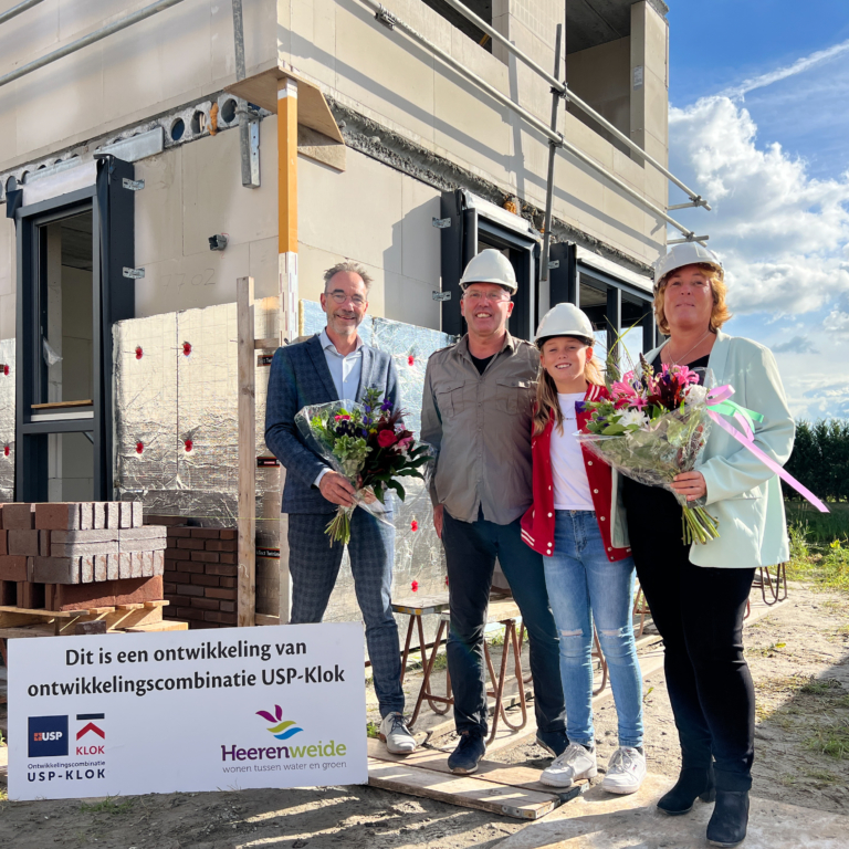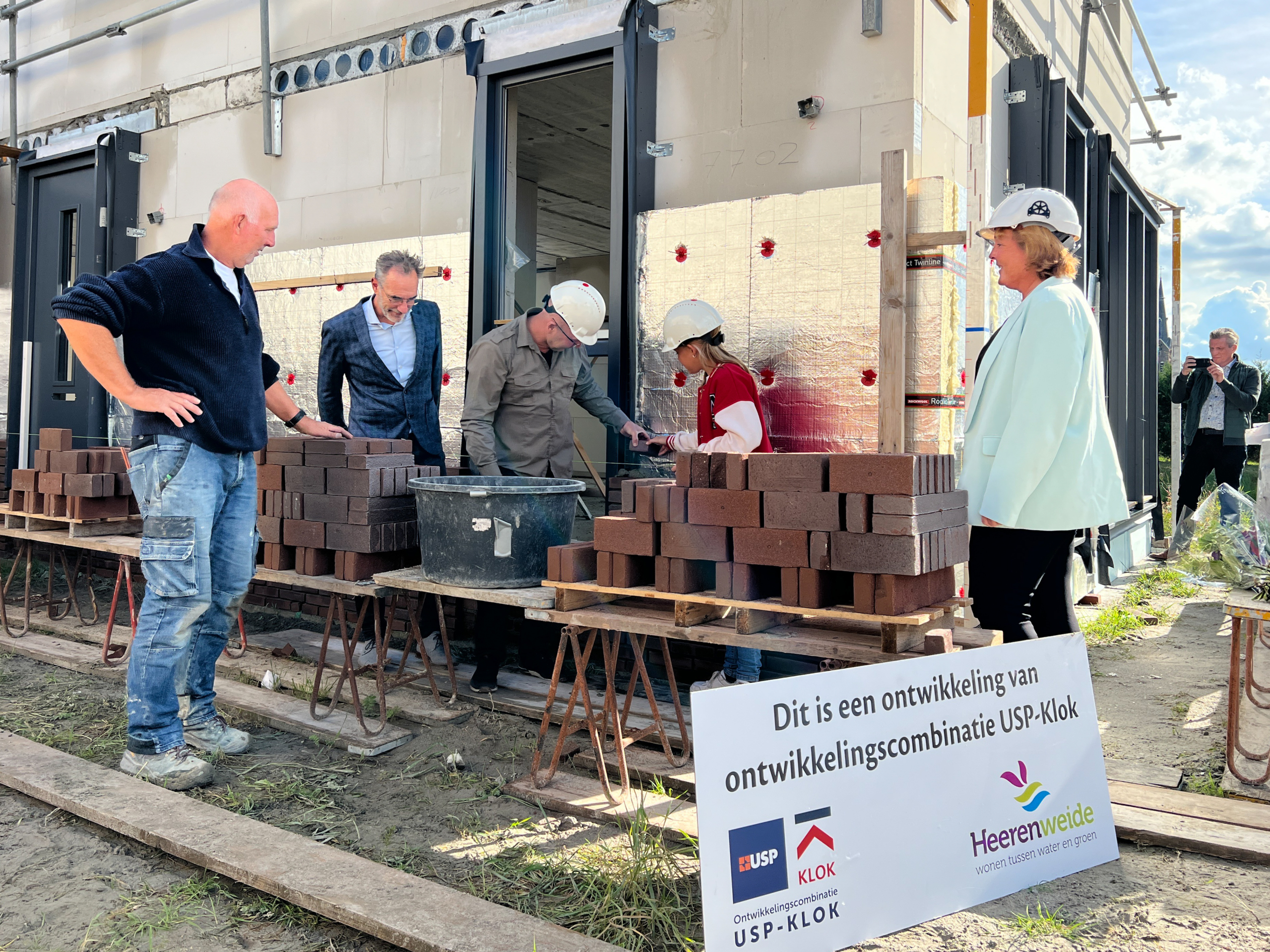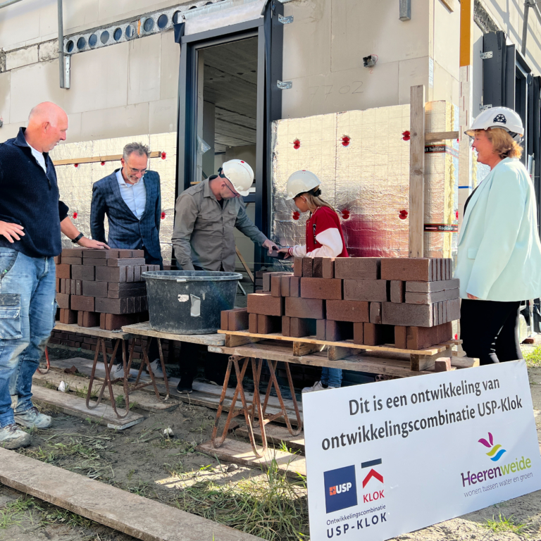 Ontwikkelingscombinatie USP-Klok metselt samen met wethouder en toekomstige bewoners feestelijke steen van laatste fase plan Heerenweide te Opmeer