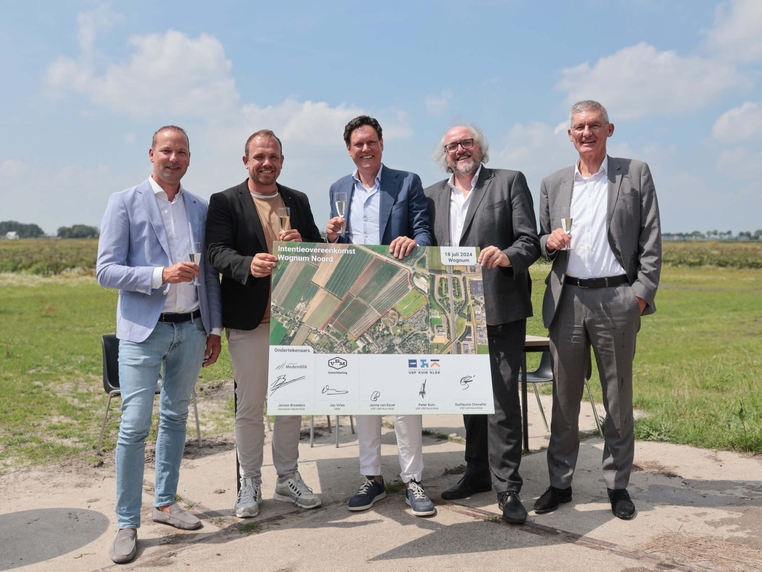 In juli vorig jaar heeft de gemeenteraad van gemeente Medemblik unaniem besloten om door te gaan met de woningbouwontwikkeling op locatie Wognum Noord. Gedurende het afgelopen jaar hebben de ontwikkelaars VOF USP-Kuin-Klok en VBM, samen met de gemeente Medemblik, een intentieovereenkomst opgesteld. Op 18 juli jl. is deze overeenkomst symbolisch ondertekend door wethouder Jeroen Broeders van gemeente Medemblik en de ontwikkelaars van VOF USP-Kuin-Klok en VBM. Onder het genot van een glas champagne werd stilgestaan bij deze belangrijke stap in de gezamenlijke ontwikkeling.