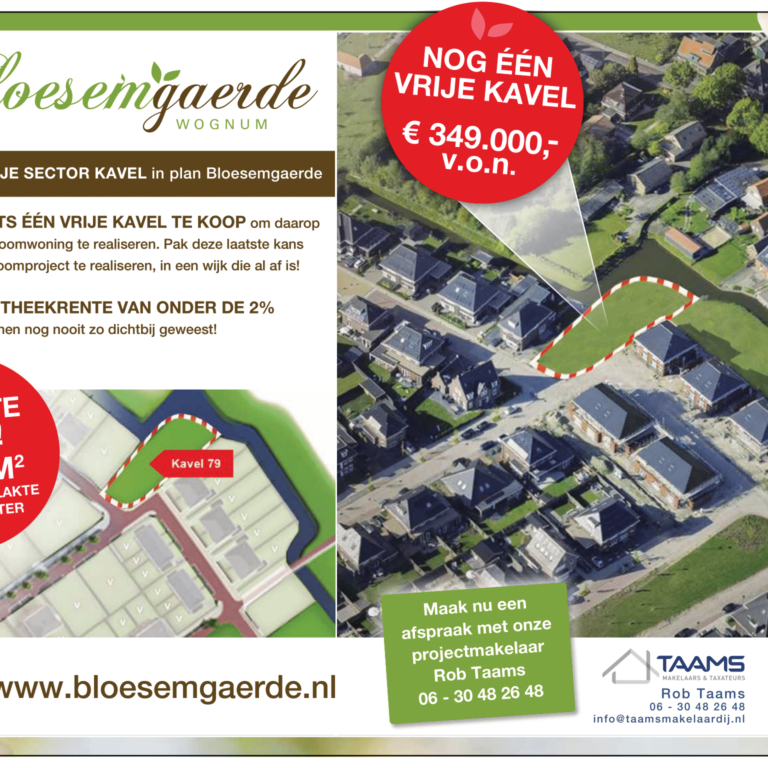 We hebben nog 1 kavel te koop in plan Bloesemgaerde te Wognum. Pak deze laatste kans en laat uw droomvilla bouwen op een kavel van maar liefst 1.070 m2 aan het water! Voor meer informatie kunt u contact opnemen met projectmakelaar Rob Taams. 06-30 48 26 48