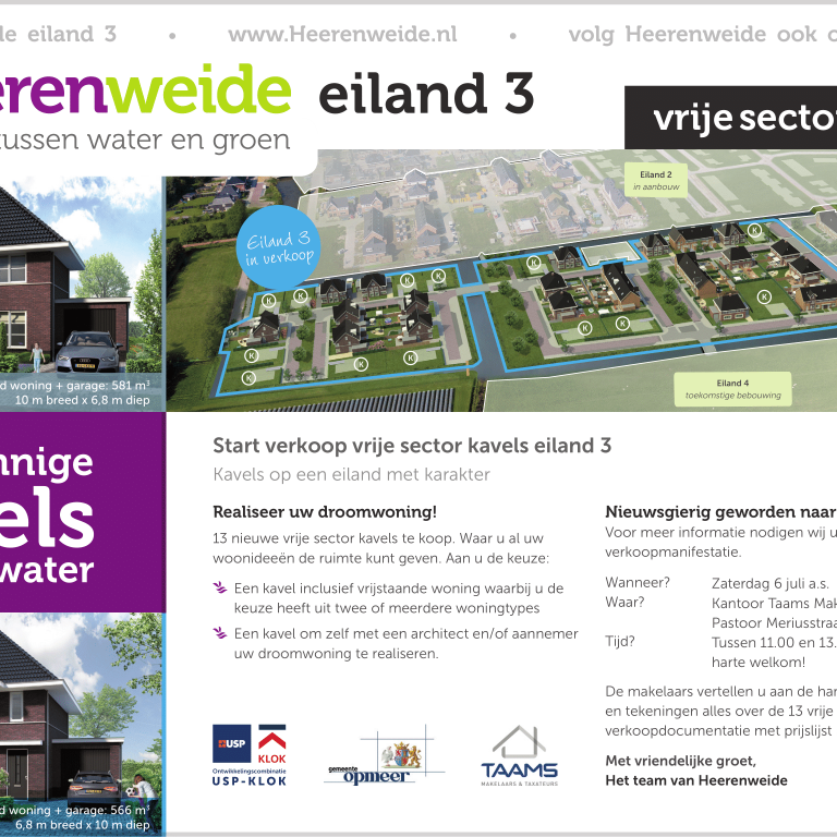 Ontwikkelingscombinatie USP-Klok en de gemeente Opmeer leggen momenteel de laatste hand aan de verkoopdocumentatie voor de 13 kavels van eiland 3 in het waterrijke plan Heerenweide. Op zaterdag 6 juli aanstaande van 11:00 uur tot 13:00 uur, is de verkoopbijeenkomst bij Taams Makelaardij & Taxateurs op de Pastoor Meriusstraat 1 in Spanbroek en kunt u de verkoopdocumentatie inclusief de prijslijst van de kavels ophalen. Wilt u uw droomwoning realiseren? Aan u de keuze: een kavel inclusief vrijstaande woning waarbij u…
