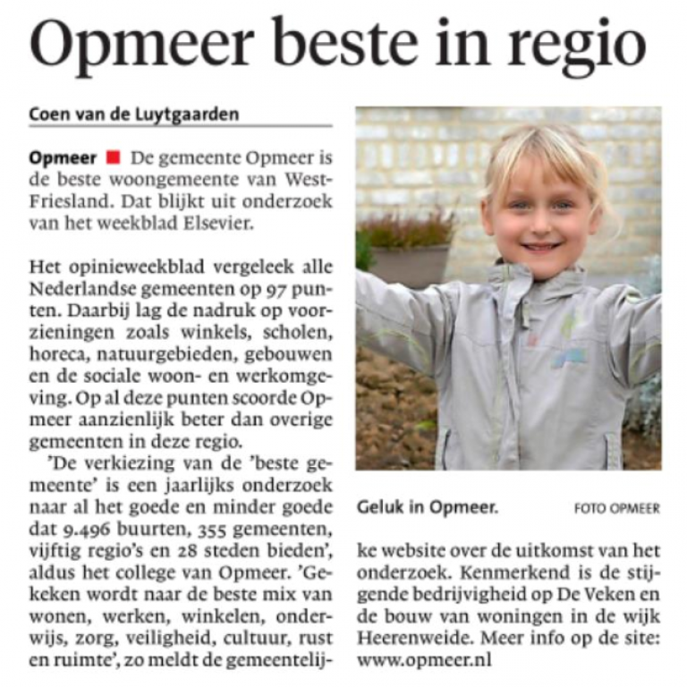 Een mooi artikel in het Noordhollands Dagblad. “De gemeente Opmeer is de beste woongemeente van West-Friesland” Wilt u ook prettig wonen in deze regio? Wij bieden in plan Heerenweide fase 3 nog een aantal prachtige twee-onder-één-kapwoningen aan. Ook voor wie droomt van een vrijstaande villa, biedt Heerenweide legio mogelijkheden. Op zaterdag 6 juli start de verkoop van vrijesector kavels! Voor meer informatie verwijzen wij u graag naar onze website: www.heerenweide.nl Voor verkoopinformatie kunt u contact opnemen met Taams Makelaardij en…
