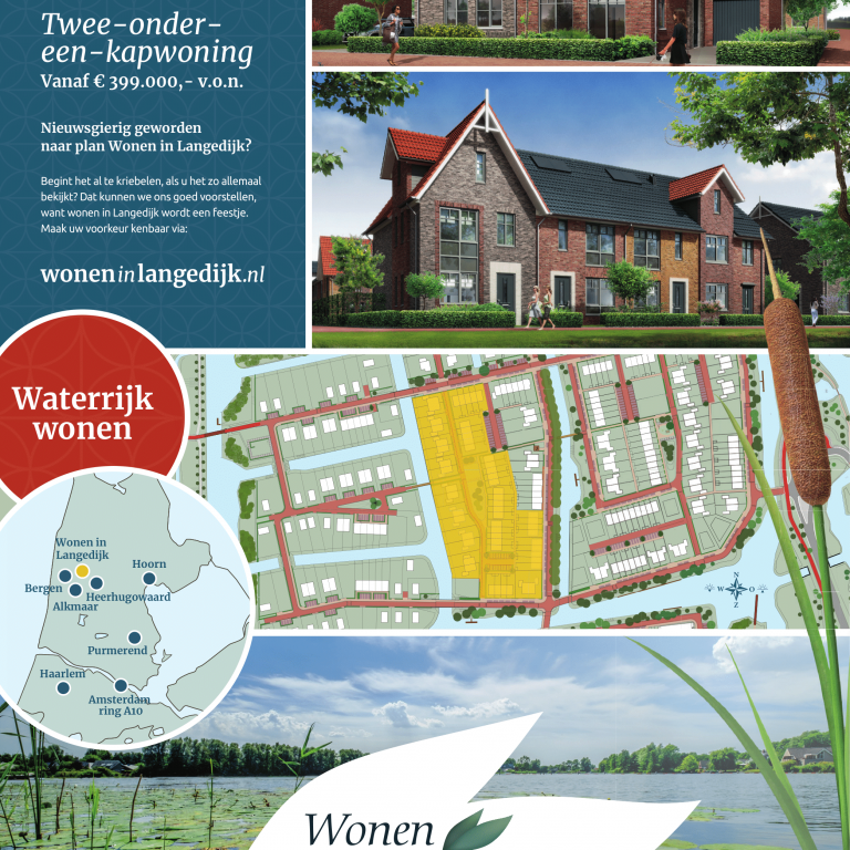 Het moment is daar! We mogen van start met de verkoop van het prachtige nieuwbouwplan. Het plan “Wonen in Langedijk” omvat royale hoekwoningen en riante twee-onder-één-kapwoningen die allemaal prachtig zijn gelegen in het ruim opgezette plan met veel groen en water. Vanaf nu is de website: www.woneninlangedijk.nl online. Hier kunt u veel informatie vinden en tevens uw voorkeur voor een woningtype kenbaar maken. Dit kan tot uiterlijk vrijdag 17 mei, 12:00 uur.