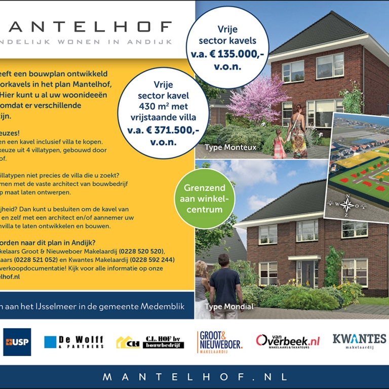Uniek, landelijk en vrijstaand wonen? Dat kan in plan Mantelhof in Andijk! Kijk voor alle informatie op de website van Mantelhof. U kunt zelf uw droomvilla laten ontwerpen of een keuze maken uit een van de vier villatypen die wij samen met Bouwbedrijf Hof hebben ontworpen. Voor de uitgebreide verkoopdocumentatie kunt u contact opnemen met Groot en Nieuweboer Makelaardij, Van Overbeek Makelaars of Kwantes Makelaardij.