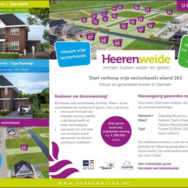 Zaterdagochtend 30 juni gaat de verkoop van plan Heerenweide 19 vrije sectorkavels van start. U bent van harte welkom tussen 11.00 uur en 13.00 uur bij Taams Makelaardij op de Pastoor Meriusstraat 1 in Spanbroek. Hier staan de makelaars voor u klaar om u meer informatie te verstrekken en de verkoopdocumentatie te overhandigen. Bezoek de projectwebsite Heerenweide voor meer informatie over het totale plan. Wij verwelkomen u graag en kijken uit naar uw komst.