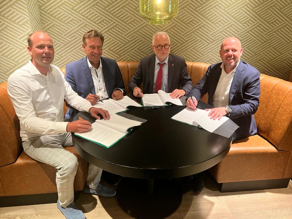v.l.n.r. Peter Kuin (Kuin Vastgoedontwikkeling), Frank Nannings (USP Vastgoed), Gerard van den Hengel (burgemeester gemeente Opmeer) en Jasper Karel (KlokGroep) ondertekenen de samenwerkingsovereenkomst.