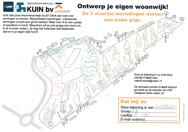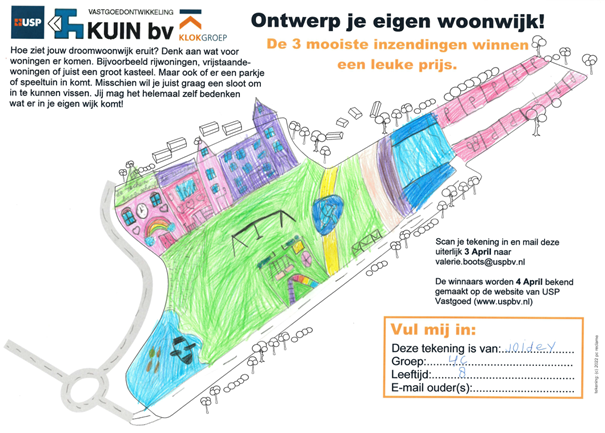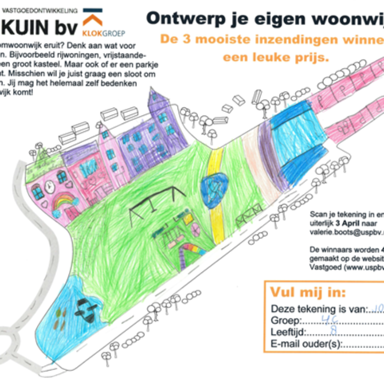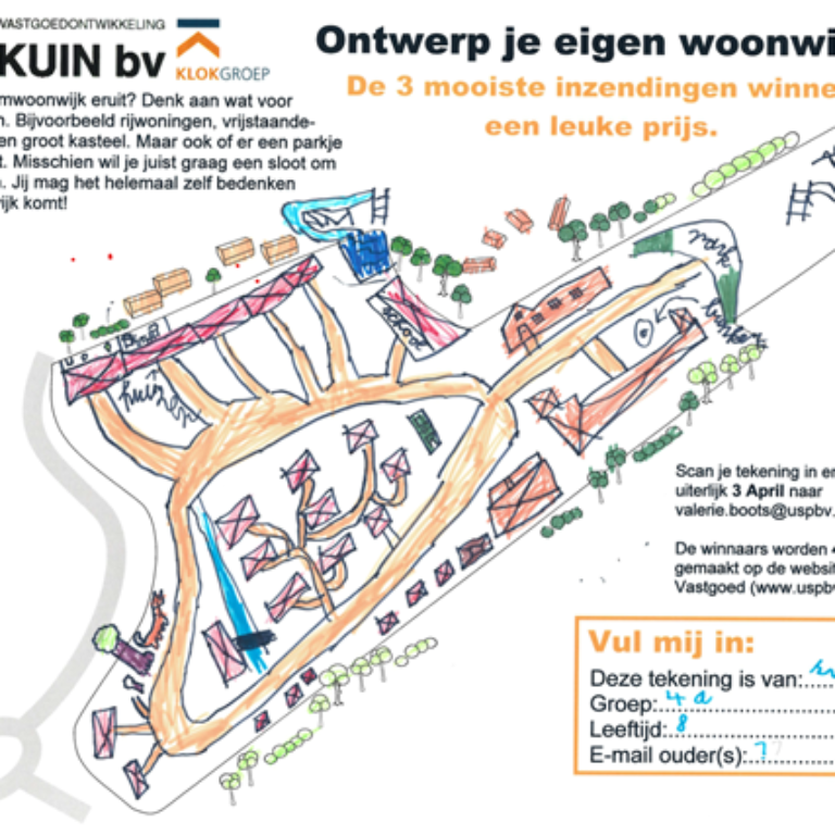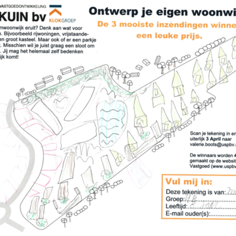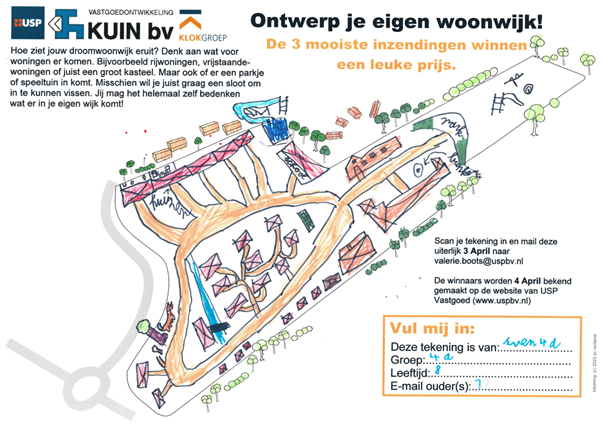 Tot slot had zij nog een mooie opdracht/prijsvraag voor de kinderen. Zelf invulling geven aan een woonwijk, hoe ziet hun droomwoonwijk er uit? Met rijwoningen of misschien wel een kasteel? Speeltuintje om te spelen of sloten om te vissen? De kinderen mochten het zelf bedenken en gingen meteen aan de slag om hun eigen woonwijk te verkavelen. Hun creatieve invulling hebben zij gedeeld met USP Vastgoed. Er zijn prachtige verkavelingen ingestuurd en hieruit zijn 3 winnaars gekomen: Sven uit groep 4a, Matthew uit groep 4b en Joidey uit groep 4c.